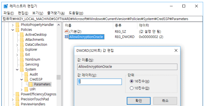 위 레지스트리 경로로 이동한 다음 AllowEncryptionOracle 값을 2로 변경한 다음 재부팅 합니다.