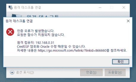 원격컴퓨터 CredSSP 암호화 Oracle 수정 때문일 수 있습니다."