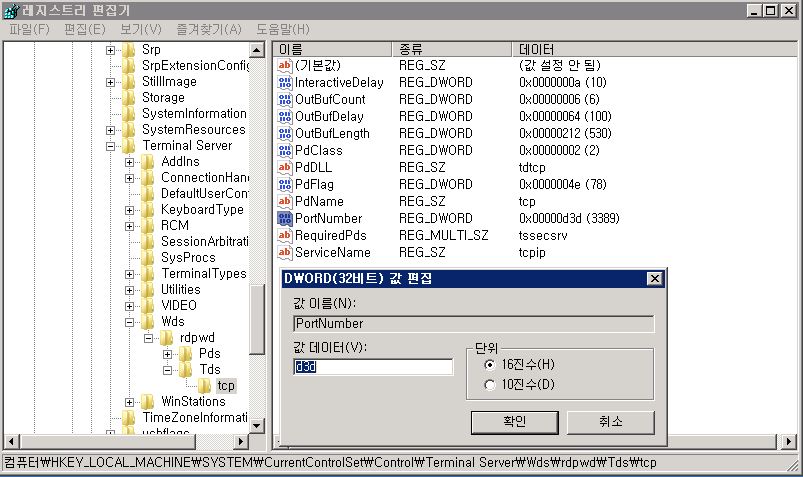 PortNumber REG_DWORD 0x00000d3d(3389) 수정모드에서 10진수를 선택하고 원하는 포트번호를 입력합니다.