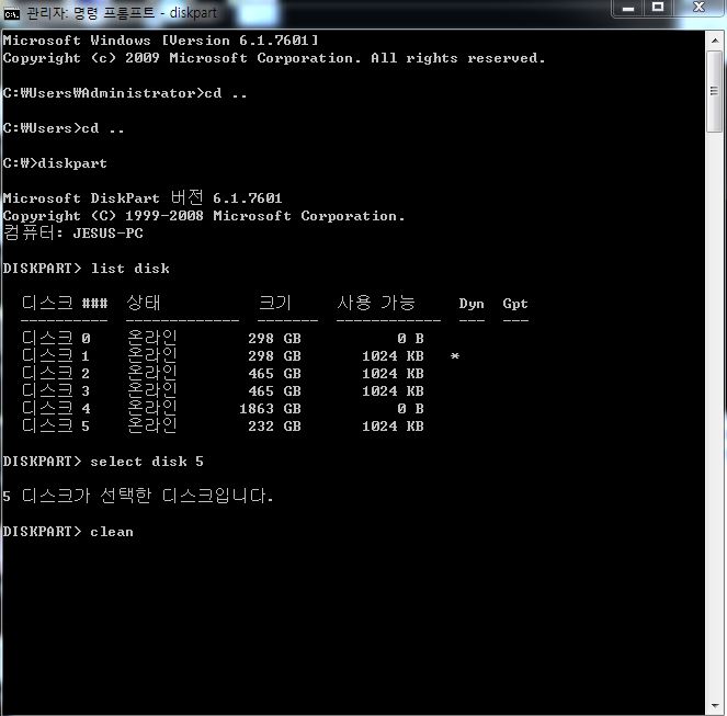 그다음 clean 명령어로 PART 클린 한다음 exit 나오면 된다.